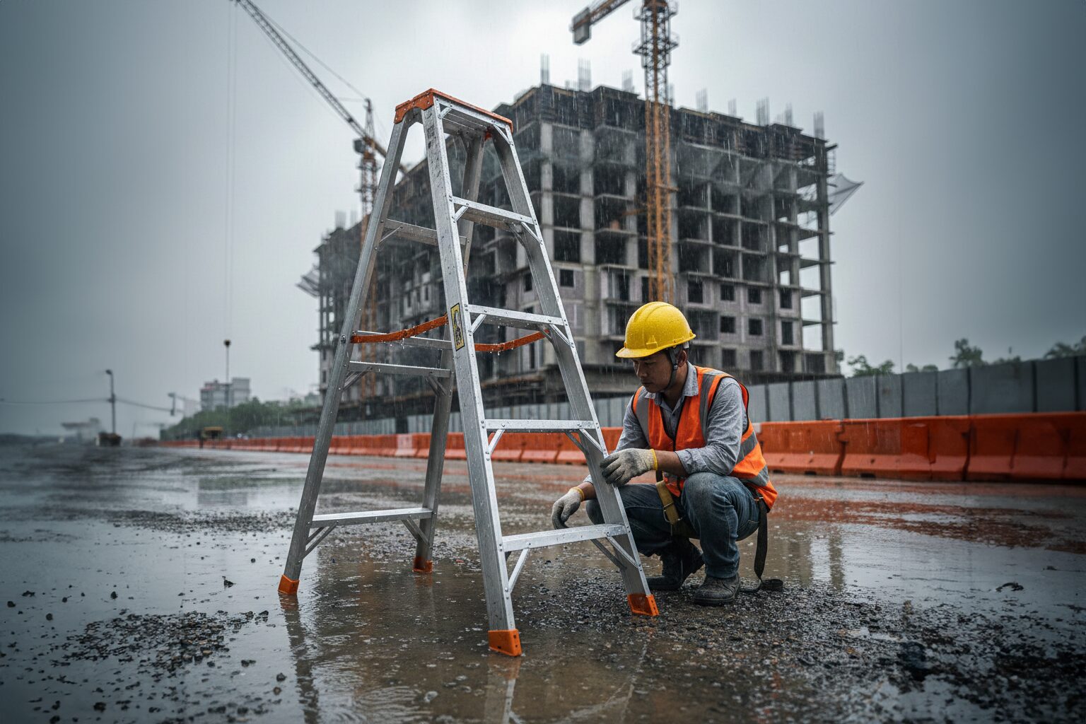 - 地盤の緩み: 未舗装の現場では、雨水を含んだ土壌が軟化します。脚立の一方の脚だけが沈下することでバランスを崩し、転倒に至るケースです。