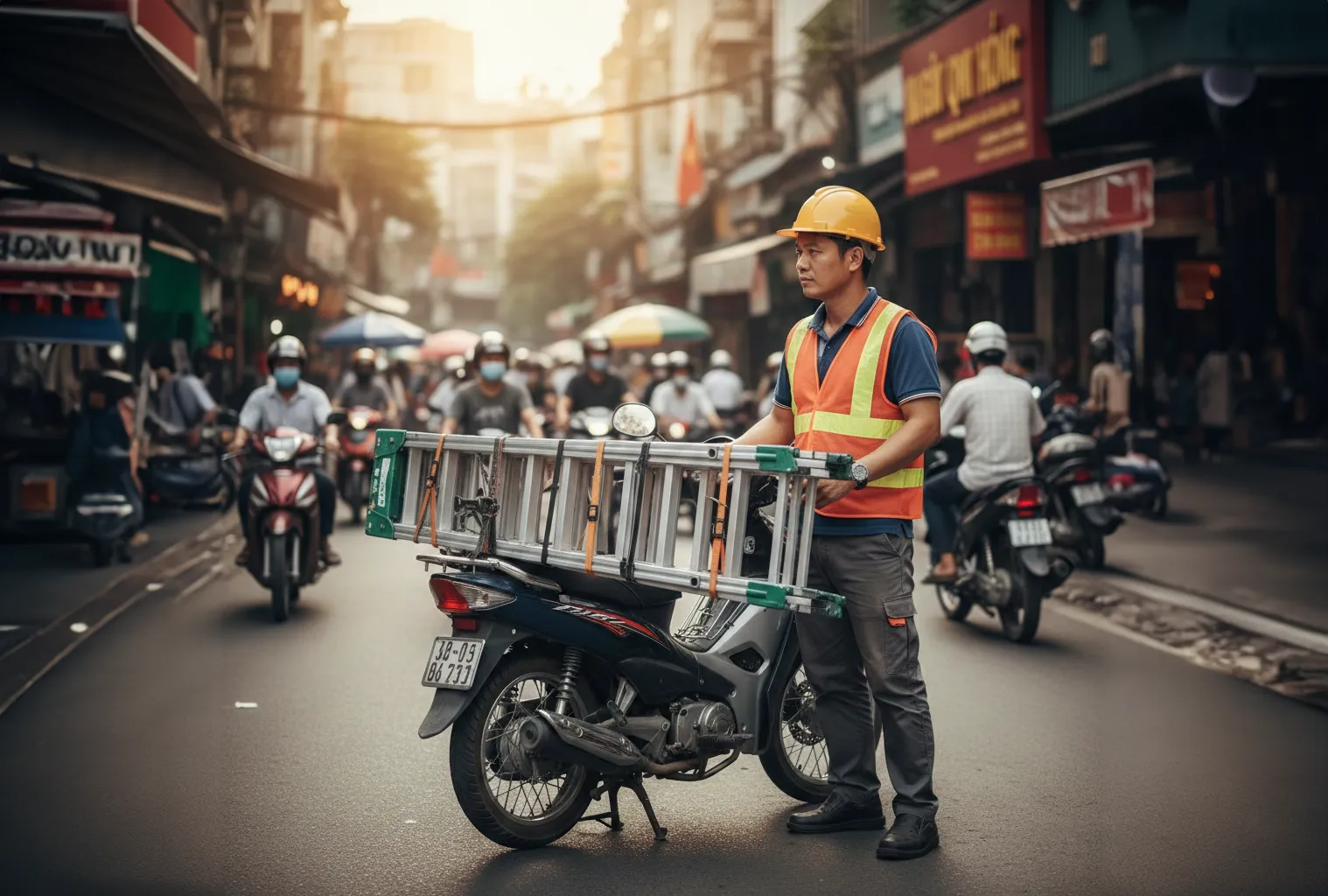 - すり抜けの危険: ベトナム特有の混雑した交通事情では、横にはみ出した脚立が他のバイクや歩行者に接触する事故が多発しています。