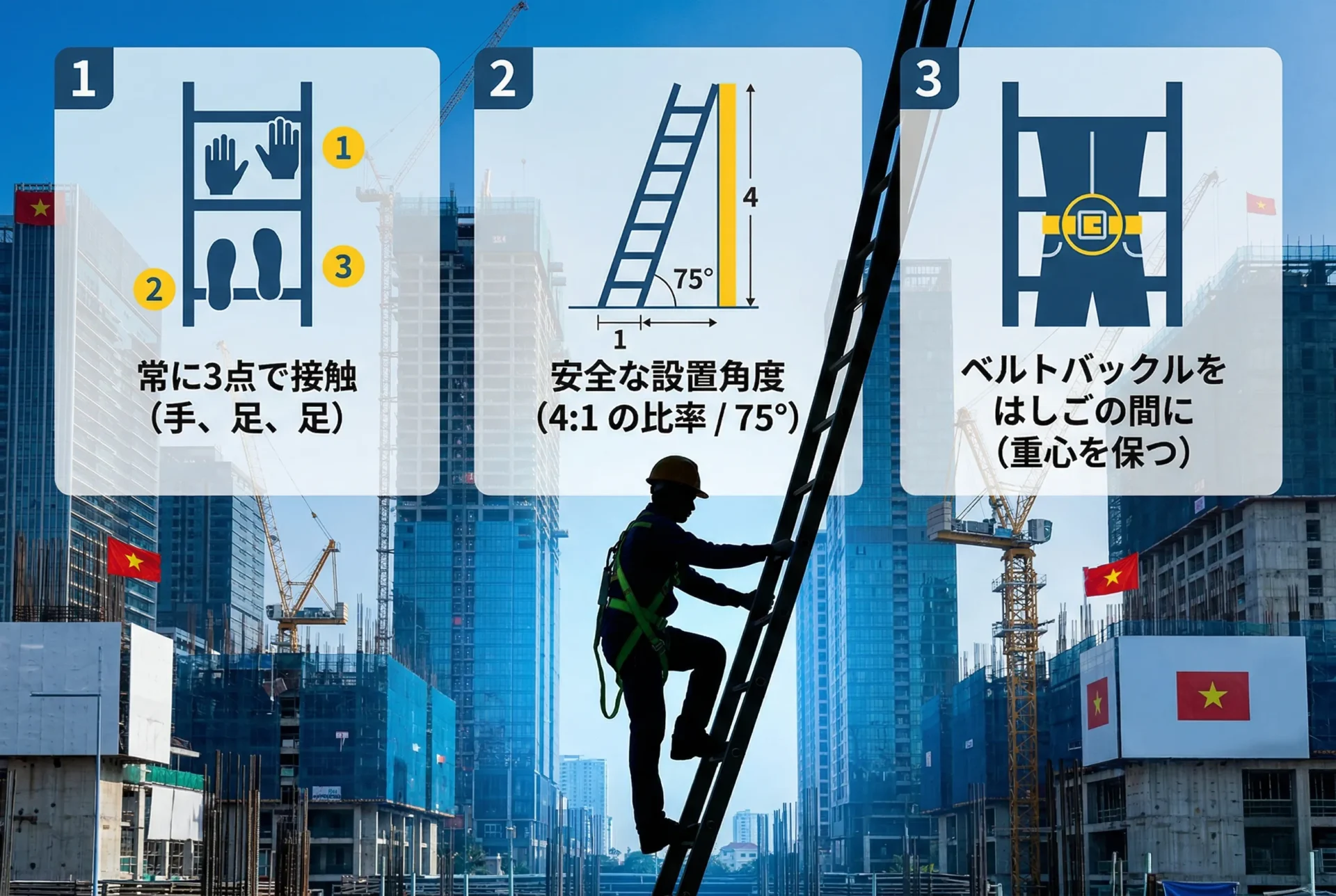本記事では、ハセガワベトナムが提唱する「誤使用を減らす“5つのルール”」を解説します。OSHA(米国労働安全衛生局)や日本の厚生労働省も推奨する「3点支持」「4対1ルール」「ベルトバックルの法則」など、視覚的で記憶に残りやすい具体的な安全基準を現場に導入することで、ヒューマンエラーを劇的に削減し、作業員の命と企業の信頼を守るための実践的なノウハウを提供します。