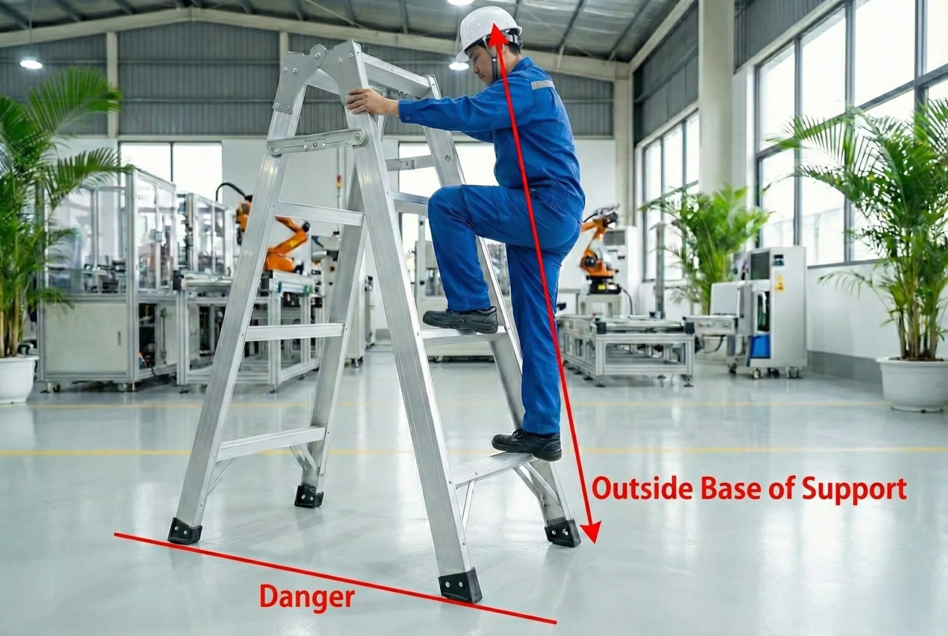 - 重心の極端な上昇: 人間の重心(へそのあたり)が脚立の頂点より遥か上に位置することになり、わずかな揺れが大きな回転モーメントを生みます。