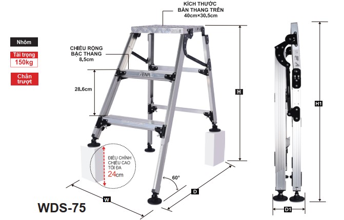 Bàn thang trên bằng nhôm gân chống trượt, hỗ trợ làm việc ổn định và an toàn.