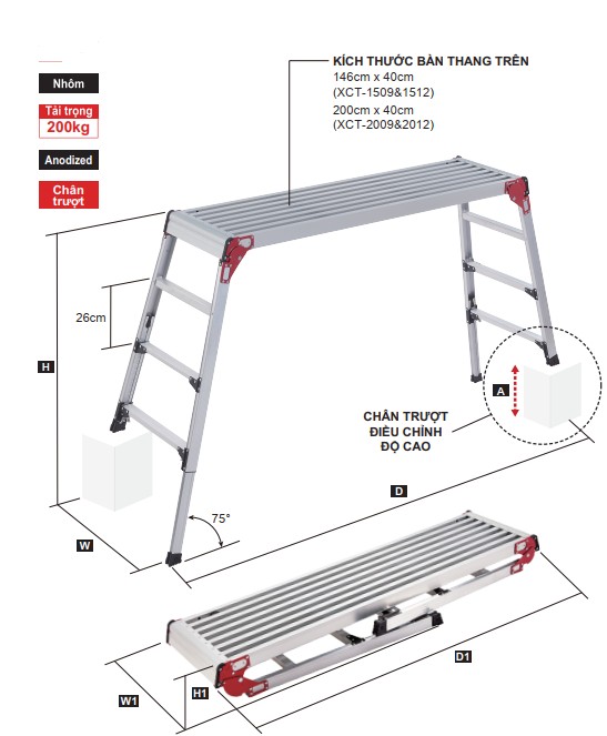 Mặt thang được thiết kế rộng rãi, mang lại sự ổn định và thuận tiện khi thao tác.